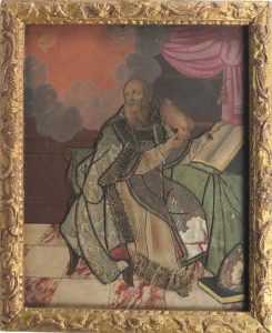 Image habillée, s.l., s.d., 2 pcs. Saint Augustin et Sainte Cécile. Tissu, papier gravé. Cadres moulurés dorés, 28,5 x 23 cm et 29,5 x 22,5 cm.