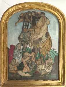 en bleu ciel avec décor partiellement gouaché, vêtements en diverses étoffes. Pièce très animée figurant 10 personnages s'affairant autour du corps du Christ.