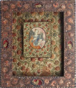 Au centre, image gouachée ovale (7 x 5,5 cm) figurant une martyre non identifiée, tenant une flèche et une palme, inscrite dans un petit cadre en marqueterie de paille polychrome (11,5 x 9 cm) sur vélin. Le tout posé en relief sur fond de vélin entièrement orné d'une marqueterie florale comportant notamment 2 cornes d'abondance. Le cadre présente 4 cartouches vitrés contenant 4 fragments d'Agnus Dei en cire.