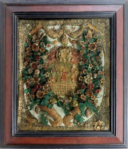 Au centre, la Sainte Famille surmontée d'un dôme avec les lettres "IHS", de 2 oiseaux et d'une guirlande et cernée d'un large guirlande de fleurs en paille et feuilles en copeaux ou papier vert jaillissant de 2 cornes d'abondance. Sur fond de papier crème. Second cadre en paille entourant le tout. Plaisante représentation polychrome, un peu naïve.
