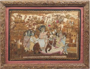 Joint, même sujet : Image habillée, s.l., s.d. Papier, tissu. Cadre mouluré doré, 32,5 x 40,5 cm. Collage gouaché, vêtements en étoffe. Une rivière entourant Jérusalem est figurée par une matière brillante. Facture naïve. (2 pcs)
