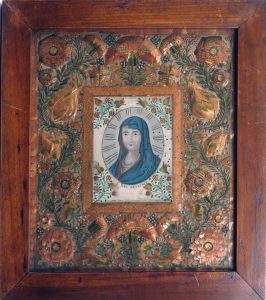 Marqueterie de paille, s.l., s.d., 2 pcs. Dei Genitrix et Salvator Mundi. Peau de vélin, paille. Cadres en bois, 31 x 27,5 cm. Travaux de vers, plus importants sur le Salvator Mundi.