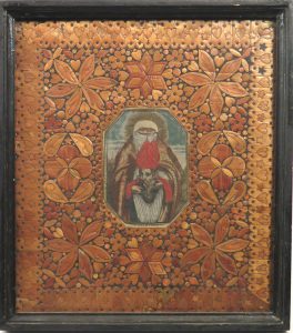 Marqueterie de paille, s.l., s.d., 3 pcs. S. Dionysius, Deus Cordis mei et Thomas a Villan. Paille, peau de vélin ou papier gravé. Cadres moulurés peints en noir, 25 x 22 cm. Minimes défauts et pet. restaurations.