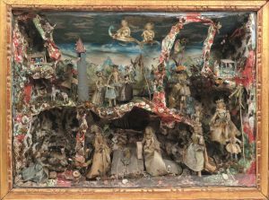 Paradis, s.l., s.d. Gloria in excelsis Deo. Cire, tissu, terre cuite, papier mâché, coquillages, matériaux divers. Dans une boîte vitrée, 42 x 55 x 16 cm, cadre mouluré doré, côtés et fond couverts de papier peint en noir.