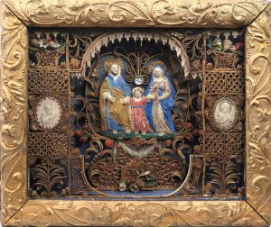 Reliquaire en pâte de reliques, s.l., s.d. La Sainte Famille. Pâte de reliques, papier roulé, divers matériaux. Dans une boîte vitrée, 30 x 36 x 6 cm, cadre mouluré doré, côtés couverts de papier vert. Motif central craquelé.