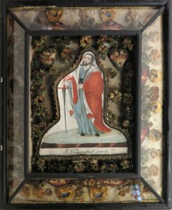 Au centre, image gouachée à pourtour irrégulier bordée d'un galon doré et cernée d'un décor floral rehaussé et doré, avec 2 reliques posées sur des coeurs en tissu (Vincent et Claude). Dans la partie inf., petite tresse de cheveux. Dans le pourtour biseauté du cadre, décor similaire et 8 autres reliques plus petites sur fond de soie rouge (saints martyrs non ident.). Selon des notes en néerlandais au verso du cadre et émanant du collectionneur, l'image fut confectionnée par le prêtre mineur franciscain de Wael pour être offerte à Vincentius de Warimont lors de son ordination en 1798; prêtre à Bastheers (Limbourg), ce dernier la légua à Marie Vandervelde en 1825 ou 1832, qui la légua à son tour à sa fille Rosalie Stevens en 1884; Rosalie la "refit" (restaura, rafraîchit ?) le 6/9/1885.
