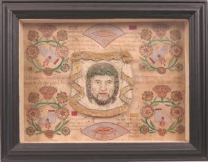 Reliquaire, Flandre, s.d. La Sainte Face et les plaies du Christ. Matériau moulé (papier mâché ou mie de pain ?), tissu, papier. Dans une boîte vitrée, 34 x 43,5 x 6 cm, cadre de bois peint en brun, côtés et dos couverts de papier beige....