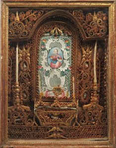 Au centre, canivet sur peau de vélin figurant le saint dans un cartouche ovale, "posé" sur un autel en papier roulé doré sur tranches supportant un ostensoir, flanqué de 6 candélabres et comportant une relique (Pierre), cerné d'un important décor de même papier. Dans la partie sup., un dôme en relief. Sur les côtés, 6 autres reliques plus petites (Martha, Augustin (?), Catharina, Vital, les 2 derniers peu lisibles). Jolie pièce architecturale se développant sur 2 niveaux. Selon une coupure de presse jointe, acquise dans une vente d'Auch-en-Gascogne le 26/7/1991.