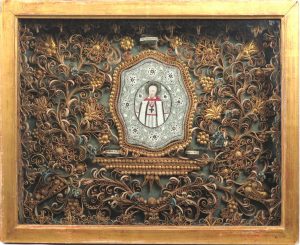 Au centre, canivet gouaché d'une extrême finesse (10 x 9 cm) représentant un saint vêtu d'un camail sur lequel se détache une croix, d'un surplis et d'une étole de dentelle, sur fond de soie bleu clair et cerné d'un cadre de papier roulé doré sur tranches. Le cadre est "posé" sur un entablement composé de perles de même papier en relief et entouré d'un décor floral de même papier contenant 3 reliques (Mathieu ?, Jeanne de Chantal et François de Sales). Le tout posé sur fond de tabis bleu. Jolie pièce rehaussée de qqs touches de bleu et de rose.