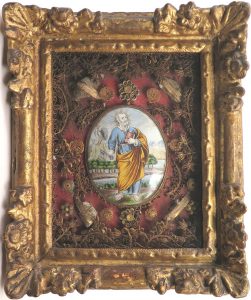 Au centre, médaillon ovale en porcelaine (10,5 x 8 cm) figurant le saint et ses attributs. Cerclé d'un décor de papier plié ou roulé doré sur tranches et de 6 cabochons de même papier, renfermant 4 reliques (Célestin, Faustin, Maximus et François de Sales). Le tout sur fond peint en rouge brique. Joli médaillon finement détaillé.