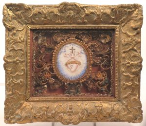 Au centre, image ovale gouachée (11 x 9 cm) figurant le Sacré-Coeur surmonté d'une croix et d'une devise ms. "Mes délices sont d'être avec les enfants de hommes" (Prov. 8,31), cernée d'un cadre ovale de papier roulé doré sur tranches et d'un décor de même papier. Dans la partie inf., relique de saint Laurent enfermée dans un petit cadre séparé. Alentour, 4 autres reliques (dont Firmin, étiq. mss peu lisibles). Le tout sur fond de reps vieux rose. Au verso, étiq. ancienne de l'encadreur, doreur et miroitier M. Tiran avec mention ms. "restauré par".