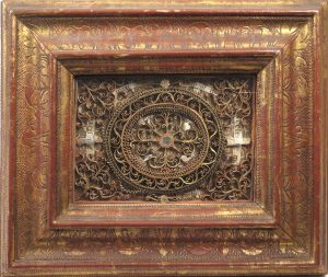 Reliquaire, France, XVIIIe s. ou plus ancien. [Sans invocation particulière]. Os, papier roulé. Cadre mouluré et gravé à patine rouge et or, 25,5 x 30,5 cm, verso partiellement recouvert du cuir d'une ancienne reliure.