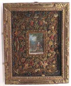 Au centre, image gouachée (8 x 5,5 cm) figurant le saint ermite à l'entrée d'une grotte, agenouillé près d'un cercueil contenant des ossements. Cernée d'un cadre ornementé de papier roulé doré sur tranches et d'un large encadrement floral de papier roulé rouge ou bleu accueillant 8 reliques (étiq. mss peu lisibles). Jolie pièce polychrome.