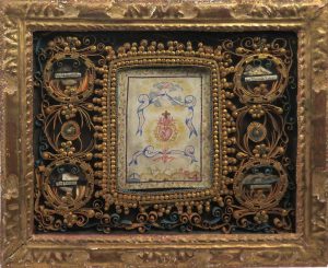 Au centre, image rectangulaire gouachée (10 x 8 cm) figurant la sainte Trinité, un coeur brûlant et une banderole légendée comme supra, inscrite dans un cadre en papier plié et roulé doré sur tranches. Sur les côtés, décor de même papier et 4 reliques dans des cadres ronds (Magdeleine, Fabian, Thérèse et Gervais). Le tout sur fond brun.
