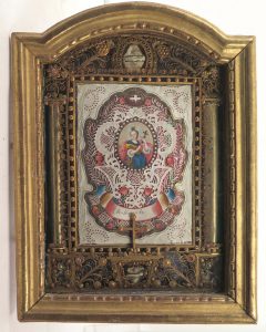 Reliquaire, s.l., fin XVIIIe s. Ste Magarite. Os, papier roulé, peau de vélin, papier métallisé. Dans une boîte vitrée, 38 x 28,5 x 5 cm, cadre mouluré doré à fronton en arcade, côtés et dos couverts de papier décoré à motif floral.