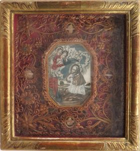 Reliquaire, s.l., s.d. Apparition de la Vierge à un saint non identifié. Os, papier roulé, papier gravé. Dans une boîte vitrée, 29 x 26,5 x 5,5 cm, cadre mouluré doré, côtés et dos couverts de papier décoré.