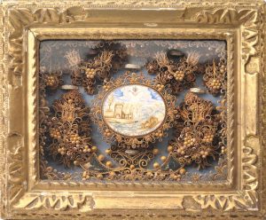 Au centre, petite image ovale gouachée (5 x 6,5 cm) figurant un coeur brûlant dans un paysage et légendée comme supra. Inscrite dans un cadre de papier roulé doré sur tranches et dans un important décor de même papier contenant 6 reliques (Trophime, Victoria, plusieurs martyrs...). Le tout sur fond peint en gris bleu. Très joli décor à la symétrie sans défaut dans lequel on remarque 2 belles cornes d'abondance dans les angles inf.