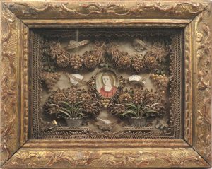Au centre, petite image gravée et rehaussée (3,5 x 3 cm) figurant le Christ enfant (?), cernée d'un léger cadre de papier plié et roulé doré sur tranches. Alentour, 7 reliques (Concessa, Carissimus, Crescentia, Crescetianus, Cassianus...) dans un important décor de même papier figurant e.a. 2 grands paniers fleuris dans la partie inf., des grappes de raisin et une large guirlande dans la partie sup. Le tout sur fond crème. Jolie pièce décorative.