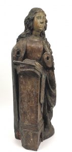 Sculpture.  Annuntiatie, 2 stuks. Vlaanderen, einde 15de - begin 16de e., 2 beelden in gepolychromeerd hout, Engel : c. 90 x 26 x 22 cm, O.-L.-V. : c. 76 x 32 x 23 cm. Van beide beelden ontbreken de handen. Mooi geheel.