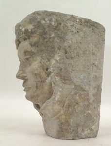 Sculpture. 4 fragmenten in natuursteen. West-Europa, 13de-16de e. Interessant lot. Vrouwenhoofd met kraag. c. 28 x 20 x 10 cm. - Schouwfragment (?). c. 28 x 11 x 21 cm. - Janushoofd. c. 26 x 18 x 13 cm. - Hoofd van bischop of abt met mijter. c. 31 x...