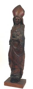 Sculpture. Bisschop met mijter en kerk (?) (Sankt Wolfgang von Steinmark ?). Duitsland, 15de - 16de e. (?), houten beeld, c. 87 x 21 x 17 cm. Vooral de achterzijde van het beeld evenals het voorwerp (kerk ?) in de hand zijn sterk vermolmd maar...