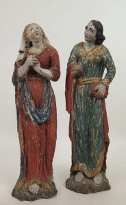 Sculpture. Golgotha, Maria en Johannes, 2 delen.  S.l., 17de e., gepolychromeerd lindenhout, 50 x 13 cm. Ontbrekende stukken, restauraties, wormgaatjes.