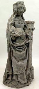 Bijgevoegd : H. Martelares (?). Vermoedelijk 19de eeuws neogotisch, c. 72 x 24 x 15 cm, natuursteen. In de rechterhand houdt de heilige een boek vast, de linkerhand ontbreekt. Aan haar voeten ligt een schaap waarvan de kop ontbreekt. - Madonna met kind. Vermoedelijk 19de e., c. 104 x 42 x 21 cm, natuursteen. Hoofd en 2 kleine fragmenten afgebroken. (3 st.)