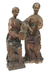 Sculpture. Maria, Jezus en nicht Elisabeth (?). Frans (?), 17de-18de e., hout, c. 53 x 35 x 19 cm, samengesteld uit 2 stukken nog gedeeltelijk met elkaar verbonden. Verschillende fragmenten ontbreken, o.m. het hoofd van het kind, de arm van...