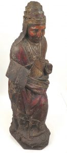 Sculpture. Paus. Frans, 17de e. (?), gepolychromeerd hout, c. 110 x 35 x 16 cm. Oude polychromie, achterkant door houtworm en/of vocht beschadigd maar geconsolideerd, linkerhand ontbreekt.