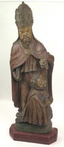 Sculpture. Paus. Zuid-Europa (?), eind 17de-begin 18de e., gepolychromeerd dennenhout (?), samengesteld uit 3 delen, c. 107 x 38 x 31 cm. Vlakke achterzijde. Lacunes in de polychromie.