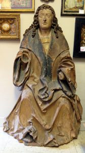 Sculpture. Salvator Mundi. Zuid-Europa, 15de e. (?), gepolychromeerd houten beeld, c. 122 x 68 x 24 cm. Handen ontbreken. Vlakke achterzijde.