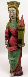 Sculpture. St. Barbara met toren. S.l., s.d., gedeeltelijk gepolychromeerde eik, 100 x 29 cm. Restauraties, achteraan metalen haak.