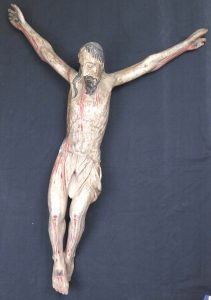 Sculpture.  Gekruisigde Christus. Zuid-Europa, vermoedelijk Spanje, 17de e., originele polychromie op lindenhout, c. 108 x 94 cm armwijdte. Beperkte restauratie aan schouders.