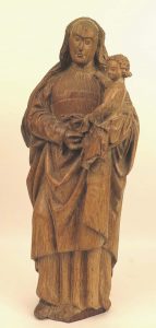 Sculpture.  Madonna met kind. Duits, 16de e. (?), afgeloogd eikenhouten beeld, c. 65 x 26 x 18 cm.