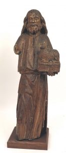Sculpture.  Sint-Jan de Doper (?). Vlaanderen, 16de - 17de e. (?), afgeloogd eikenhouten beeld, c. 60 x 25 x 19 cm. Het onderste gedeelte van het beeld (voeten) is afgezaagd, linkerhand en snoet van het lam afgebroken.