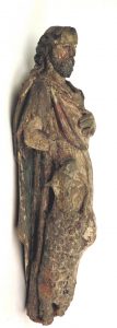 Sculpture.  Sint-Jan de Doper. Vlaanderen, 17de e., lindenhouten (?) beeld, c. 61 x 24 x 23 cm. Resten van polychromie, sporen van geconsolideerde vermolming aan de onderzijde.