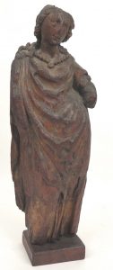 Sculpture.  Vrouwen figuur (Martelares ?). Vlaanderen, 16de e. (?), gepolychromeerd eikenhouten beeld waarvan de polychromie bijna geheel verdwenen is, c. 48 x 17 x 9 cm. Vermolming vooral aan de bovenzijde van het hoofd. Gezicht (vnl. neus)...