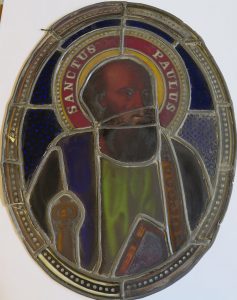 Vitrail, s.l., XIXe s. Sanctus Paulus. Verre, plomb, ovale 66 x 52 cm. Qqs pièces cassées, fêlées ou déboîtées.
