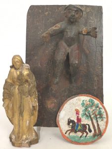 Enfant Jésus couché, s.d., bois sculpté, +/- 16 x 10 cm, appliqué sur une planche en bois, 28 x 18 cm. Traces de polychromie, facture très naïve. Manques, restaurations. - Vierge, s.d., bois sculpté et doré, 19,5 cm. Manques à la dorure, travaux de vers. - Patacon, s.d., plâtre peint, diam. 11,5 cm.