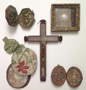 Agnus Dei en cire (diam. 4 cm) dans un décor de papier roulé doré sur tranches présentant 5 reliques. Dans une boîte, 12,5 x 11,5 cm, couverte de soie brochée. - Cabochon de porcelaine peinte (4 x 3,5 cm) figurant une sainte non identifiée, dans un décor de papier roulé. Cadre en bois mouluré doré, 12 x 12,5 cm. Travaux de vers sur le cadre. - Reliquaire de poche contenant +/- 50 petites reliques dans des compartiments de papier roulé, protégées par 2 vitres (1 manquante). Dans une boîte ovale, 7 x 9 cm, couverte de chagrin noir estampé à froid, crochet de fermeture. - Reliquaire de poche contenant une petite Vierge moulée et 17 reliques dans des compartiments de papier roulé, protégées par 2 vitres. Dans une boîte octogonale en bois, 7,5 x 8,5 cm, crochets de fermeture. - Croix-reliquaire en bois sculpté à surface vitrée, 28 x 18 cm, contenant une statuette moulée de la Vierge et 6 reliques dans un décor de papier roulé.