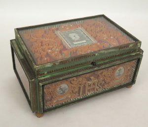 Luxueux coffret à bijoux ou nécessaire de couture d'une dévote, couvert à l'extérieur de papier gaufré vert, arêtes bordées d'une frise de papier doré. Les 4 faces vitrées, en relief, contiennent un décor de papier roulé orangé doré sur tranches semé de petites perles de diverses couleurs et de "perles" de même papier, et 5 images pieuses gravées sur acier et rehaussées, celle de la face sup. inscrite dans une dentelle mécanique; grand monogramme "IHS" inscrit dans la face antérieure. Intérieur couvert de même papier gaufré et doublé de velours rouge, miroir au verso du couvercle, un étage amovible. Vifs coloris et décor très symétrique.