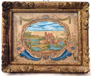 Au centre, image ovale gouachée (13 x 16,5 cm) figurant une belle bâtisse flanquée d'une roue à aubes dans un paysage de rivière. Cernée d'un cadre brodé au fil doré et peint et d'applications métallisées dorées. Dans la partie inf., 2 grandes cornes d'abondance fleuries, guirlande dans la partie sup. Très séduisante pièce joliment détaillée.