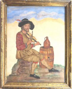 Image habillée sur fond clair, s.l., s.d., 2 pcs. Types populaires. Tissu, papier. Cadres moulurés dorés, 31 X 24,5 cm.