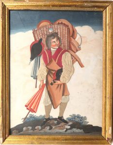 Deux pièces de mêmes facture et format (28 x 20,5 cm). Visages, mains et accessoires gouachés et collés, vêtements en étoffe; ciels et décors gouachés. Sujets : marchand de quincaillerie ambulant, son assortiment sur le dos, tenant un soufflet et un parapluie. - personnage grotesque de profil, l'épée au côté et le menton en galoche. Personnages très typés.