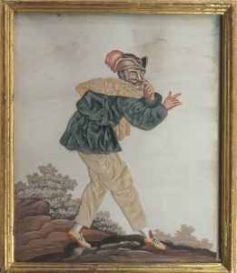 Trois pièces de facture et format similaires. Visages, mains, pieds et certains éléments gouachés, détourés et collés sur fond de vergé, corps revêtus de tissu. Qqs éléments de décor (rochers, buissons...) gouachés. Sujets : personnage grotesque. - mendiant. - homme à la pipe. Types populaires caricaturaux, voire grotesques.