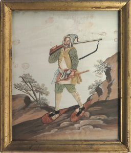 Trois pièces de formats (+/- 25,5 x 19,5 cm) et facture similaires. Visages, mains et décor gouachés sur papier, vêtements en divers tissus. Sujets : "Canadien" ou chasseur, le fusil sur l'épaule, chaussé de raquettes. - marchande de pommes. - porteur d'eau.