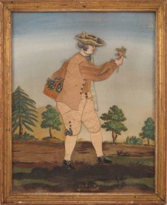 facture, formats lég. différents (25/24 x 19,5/17 cm). Visages et mains gouachés sur papier, vêtements en étoffe, décor gravé sur papier, rehaussé et collé, sol vernissé : jeune homme tenant une fleur, un panier fleuri au bras et jeune femme lui faisant signe d'approcher. La 2e pièce présente en outre un petit découpis facétieux : un homme dans le lointain semble soulever la jupe de la jeune femme.