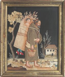 Image habillée sur fond noir, s.l., s.d. Le moine galant. Tissu, papier. Cadre mouluré doré, 31 x 26 cm. Visage, mains et éléments du décor (y compris la femme cachée) gouachés sur papier, robe du moine en tissu grossier. Etonnante image...