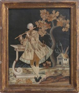 Image habillée sur fond noir, s.l., s.d., 2 pcs. Joueur de flûte et Joueuse de viole. Tissu, papier. Cadres moulurés dorés, 32 x 27 cm. Balafre dans le visage de l'homme.