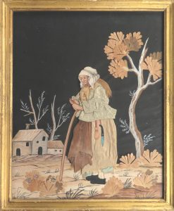 Format (+/- 25,5/27 x 20/21 cm) et facture similaires. Visages, mains et qqs éléments du décor gouachés sur papier, vêtements en diverses étoffes. Sujets : vieille femme appuyée sur un bâton. - vieux mendiant tendant son chapeau. - pêcheur à la ligne assis au bord de la rivière. - femme du peuple portant un enfant sur son dos. Plaisant ensemble.